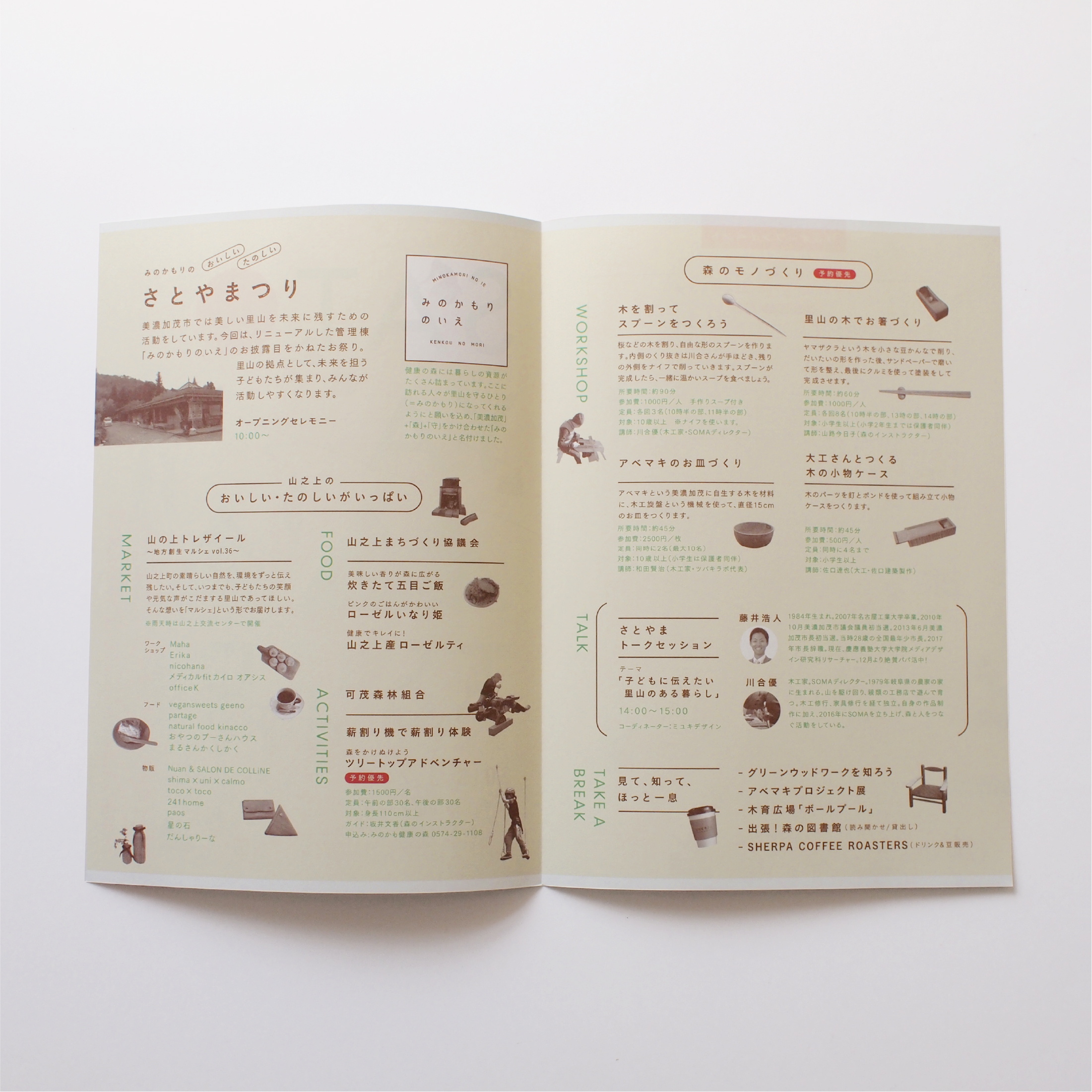 WORKS flyer さとやまつり さとやまつり 木工ワークショップや薪割り体験など、さとやまならではの楽しみが満載のイベントのチラシ。切り抜き写真を多用して楽しさの伝わるビジュアルとしました。 Year 2019 Creative direction 末永 三樹(ミユキデザイン) Art direction, Graphic design 森 美佳(zoomic) Client 可茂森林組合 イベント告知テイスト_POP美濃加茂市 一覧に戻る < PREV NEXT >