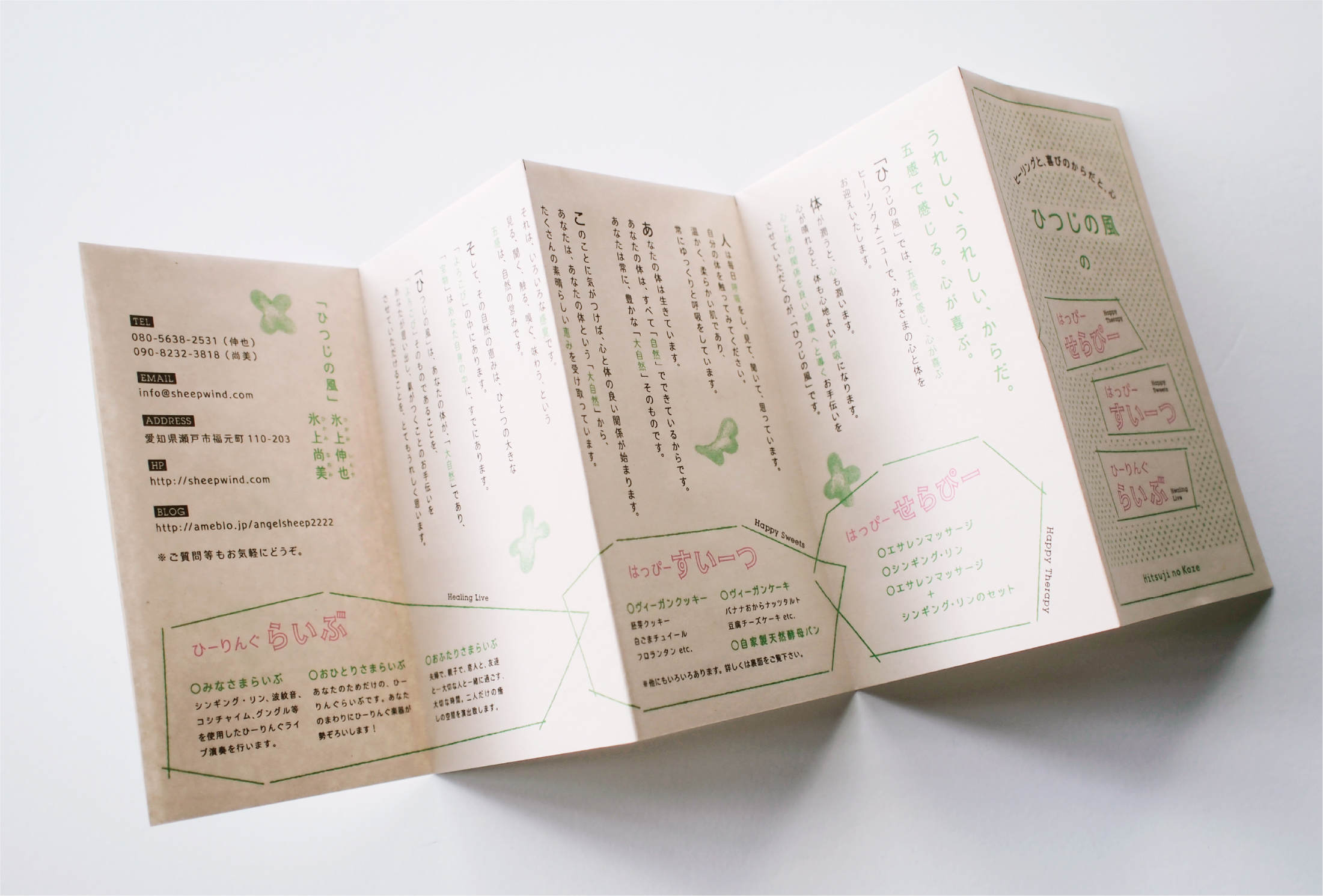 WORKS pamphleaflet ひつじの風 ひつじの風 シンギング・リンを使ったヒーリングライブや、天然酵母パン、ビーガン・スイーツの販売などを中心に活動する「ひつじの風」。A面では全体の活動を、B面ではその中の天然酵母パン、ビーガン・スイーツの内容を紹介した両表リーフレットです。 Year 2013 Art direction, Graphic design 森 美佳(zoomic) Client ひつじの風 テイスト_ナチュラル 一覧に戻る < PREV NEXT >