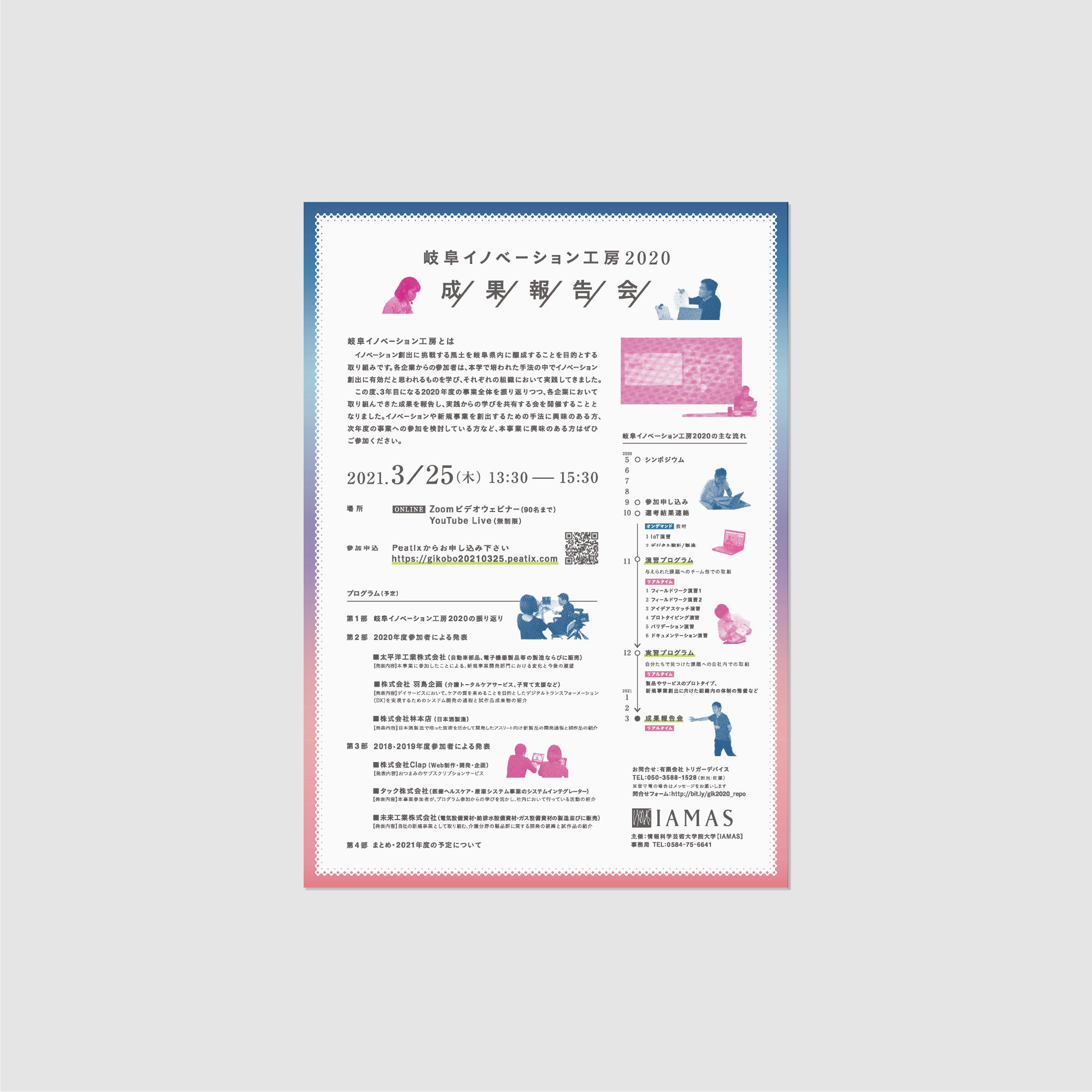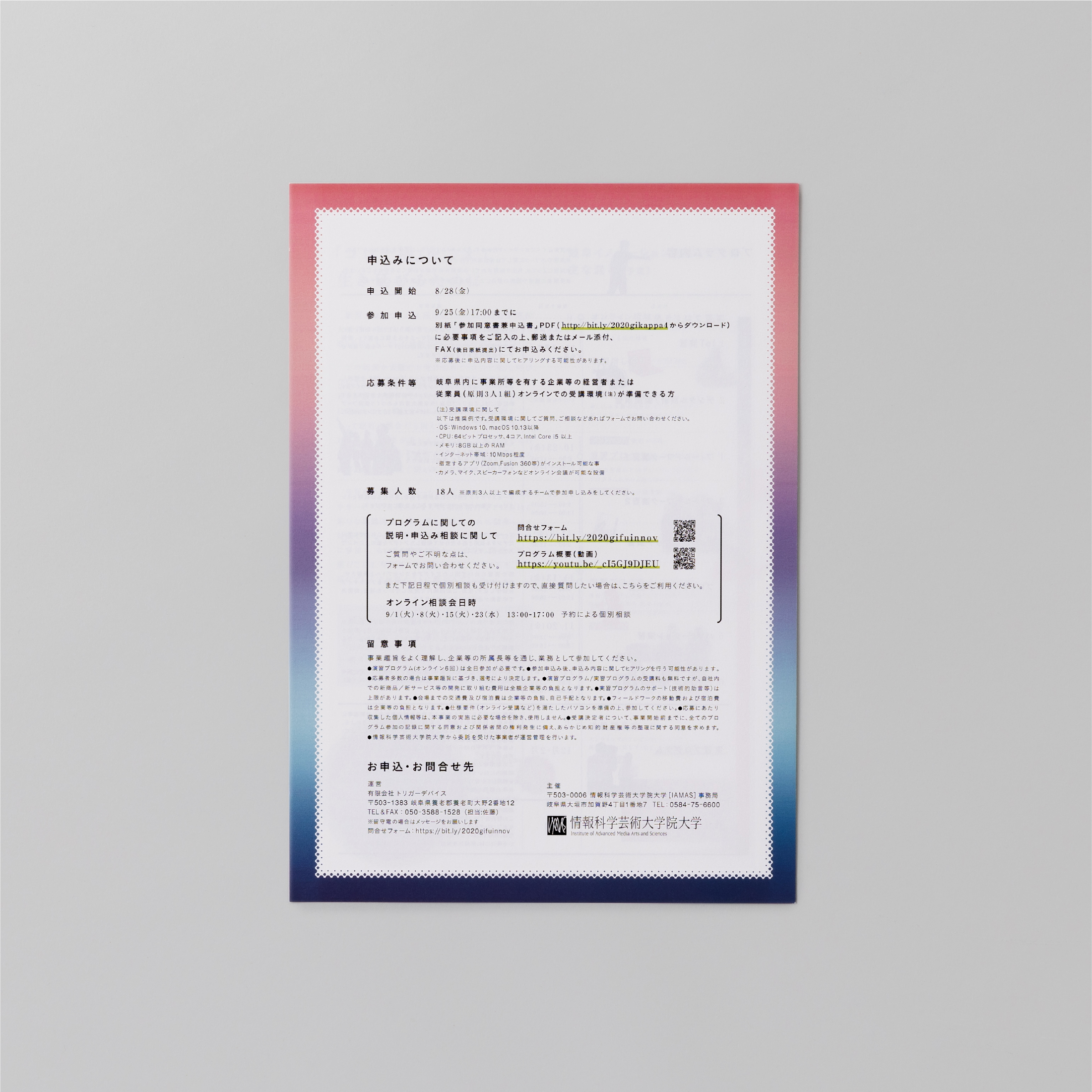 WORKS flyer 岐阜クリエーション工房2020 募集要項/成果報告会 岐阜クリエーション工房2020 募集要項/成果報告会 Year 2020 Art direction, Graphic design 森 美佳(zoomic) Client 情報科学芸術大学院大学[IAMAS] IAMASテイスト_クール大垣市岐阜県 一覧に戻る < PREV NEXT >