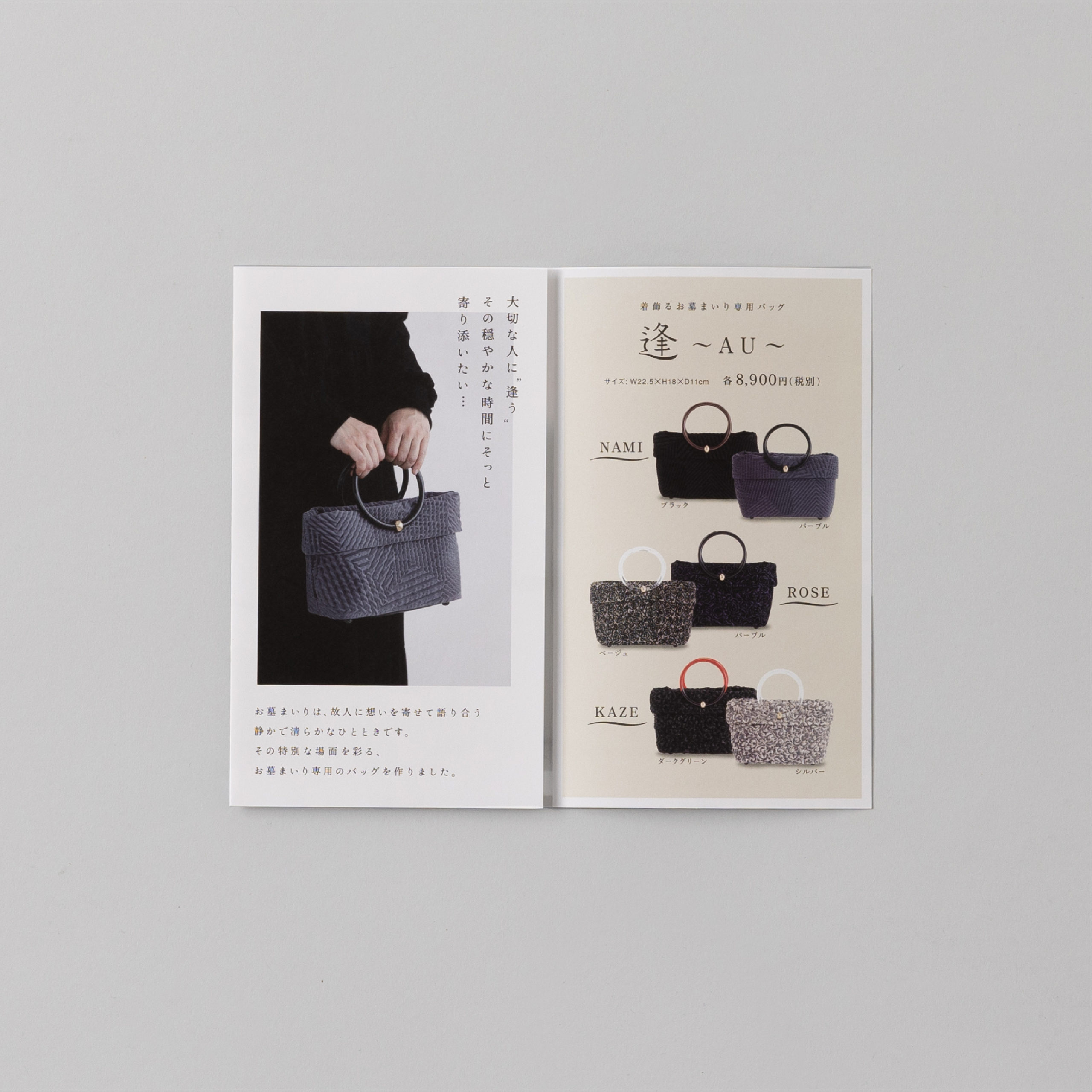 WORKS pamphleaflet 逢 〜AU〜 逢 〜AU〜 お墓参り専門バッグ。モダンな「現代の和」を意識してつくりました。 Year 2020 Art direction, Graphic design 森 美佳(zoomic) Photography 中村イチ(studio bridge) Client 株式会社コモテキスタイル テイスト_ナチュラル和大阪女性向け 一覧に戻る < PREV NEXT >